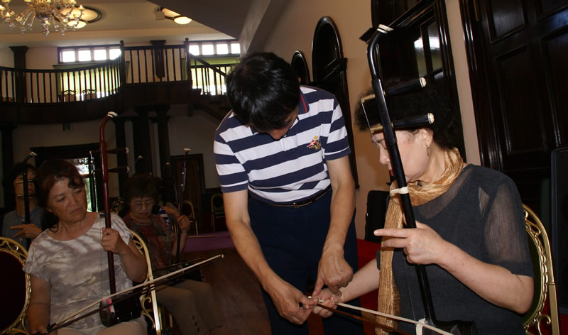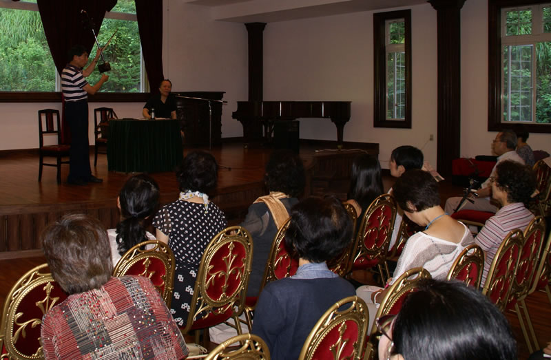 演奏会終了後、王先生と37名の合宿参加者は、大型バスで大分県九重町の温泉郷「湯壺亭」に向かいました。青々とした山河に囲まれたすばらしい景色が広がる中、二胡講座は19世紀イギリス風建築の小さいミュージック・ホールで開かれました。王先生は数十年に及ぶ教学経験から、二胡の歴史や発展、更に二胡演奏の基本技巧からいくつかの曲の特徴までを、一気に精確で簡単明瞭に解説されました。右手運弓と左手の構えの関係、”換把”など基本奏法の重要性と訓練方法の解説を除き、参加者全員一人一人に向き合い直接指導、それぞれの異なる問題に対し正確に指導・解決していきました。合宿の最後は、一人一人が舞台に上がり得意曲を披露、その演奏に対し王先生からは根気強く細やかな講評を頂きました。昼間だけでは時間が足りず夕食後も続きましたが、王先生は労力も厭わず指導に当たり、参加者皆大変得るものが有った、満足のいく合宿となりました。