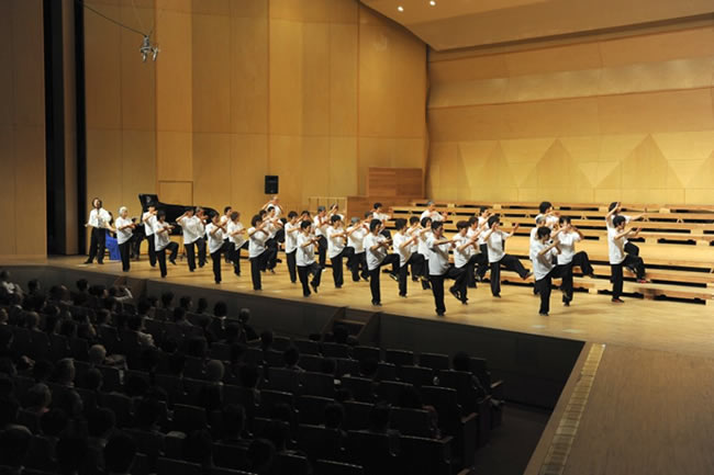 以上のプログラムで第一部の演奏をさせていただきました。総勢72名による太極拳は、劉先生とピアノの生演奏でとても素晴らしいものでした。会場は、静まりかえり、観客は二胡とピアノ、太極拳の動きに見入っていました。生演奏での演奏は初めてという日中友好協会の皆さま、演舞を終えられた後の笑顔は印象的でした。