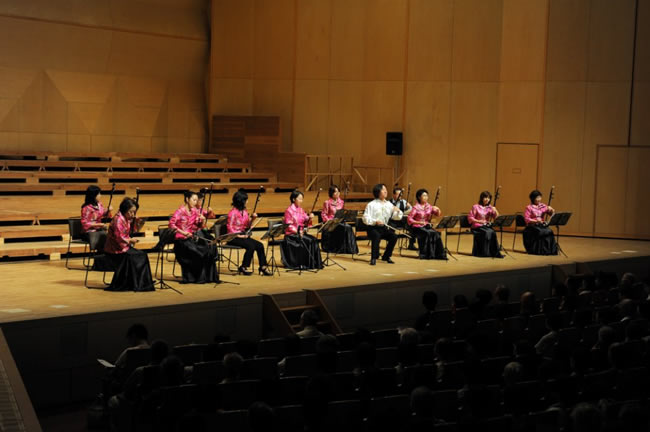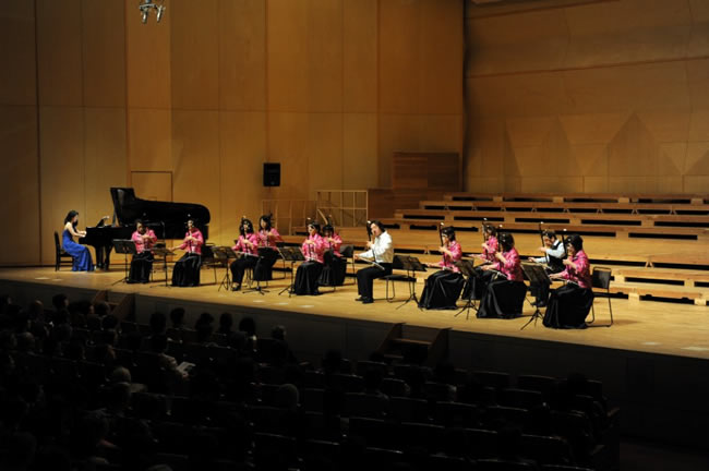 いよいよ次は教室の演奏。劉先生、佐賀教室2名、長崎教室9名、ピアノ円能寺美恵さんで、良宵、賽馬、郷の風の順で演奏させていただきました。長崎教室では、賽馬の嘶きを皆さまの前ではじめて演奏しました。各自それぞれの嘶きに会場から笑いがおこり、緊張の中にも和やかな雰囲気が感じられ、いい演奏会になりました。