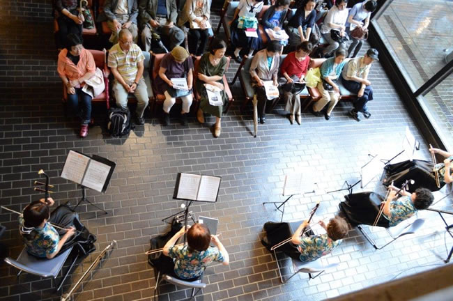 当日はあいにくの雨。早めに集合して、楽屋で少し練習。このところ、検定やコンクールなどのイベント続きでなかなか、みんなで集まって練習ができなかったこともあり、伴奏なしで予定している「花は咲く」がなかなかうまくいかず多少不安な気持ちを残しつつ、そして本番。思ったより多くの方が聞きにきてくださいました。1曲目は「郷風」。コンサートホールではありませんが、音響もなかなかいい感じで、二胡の音色が響き、多少緊張のなかで演奏が始まりました。前半3曲の演奏を終え、二胡を初めて見る方・聞く方も大勢いらっしゃるので、二胡のつくりや、音の出し方について須藤さんの説明をまじえ、後半スタート。いよいよ心配していた「花は咲く」です。ところが、みんな本番に強いのか、本番が一番いい演奏ができたのではないかと思います。そして、「賽馬」では、馬のいななきの部分はたくさんの拍手をいただき、なかなかの盛り上がり。ラスト「島の風」で締めくくり、30分のミニライブは終了。会場の皆さんからは大きく温かな拍手をいただきほっとしました。