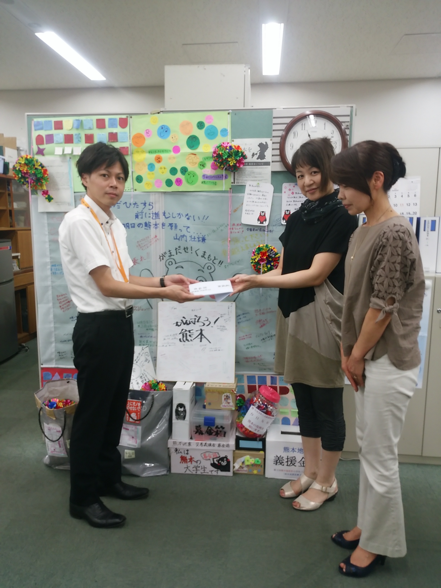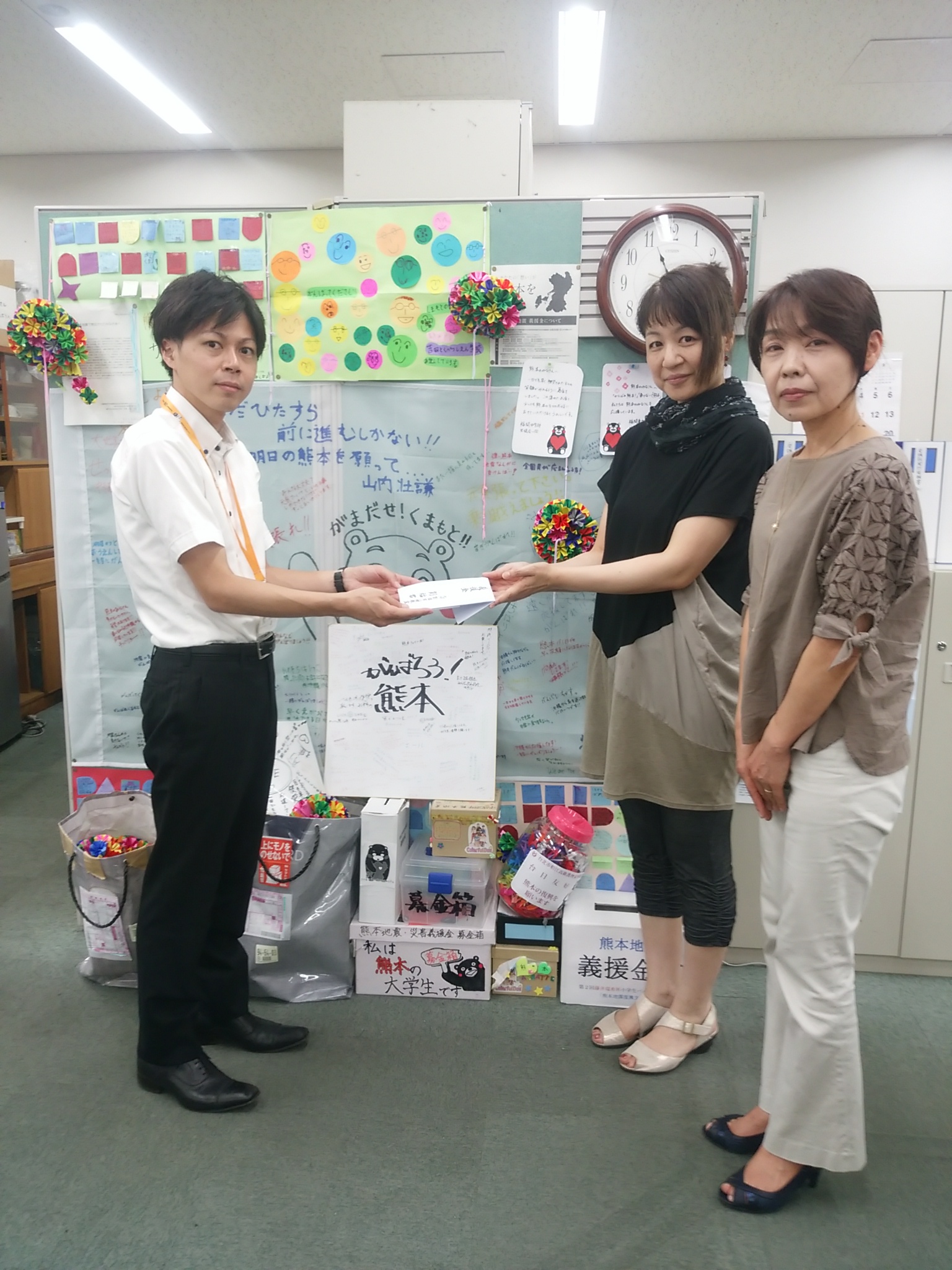 なお,コンサートにご来場のお客様よりご寄付いただきました熊本地震支援金50万円は,一日も早く被災された方々へ届きますよう、8月22日に教室を代表して熊本教室の井上さんと須藤さんが熊本県庁、熊本県健康福祉部健康福祉政策課に直接持参し納められました。支援金の中には、大阪の日本華楽団の4万円も含まれています。皆様から暖かいご支援とご協力をいただきまして心より厚くお礼申し上げますとともに熊本で被災された方の一日も早い復興を願っています。