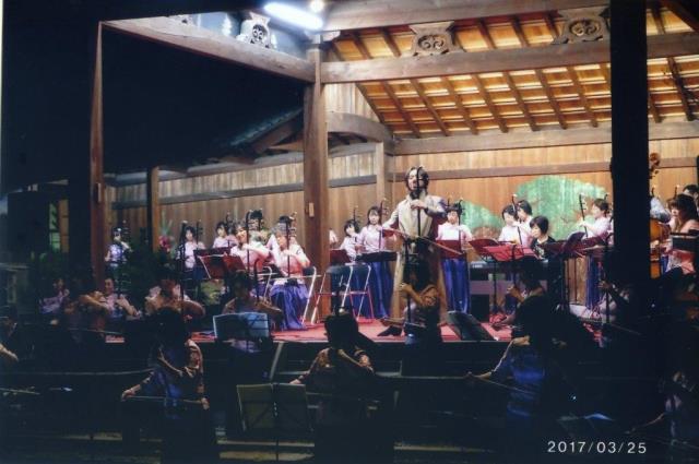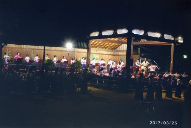 リハーサルの後、能楽殿へ移動しました。心配された雨が上がり、薄暗くなった能楽殿に、竹やポットの明かりが灯され、桜の木の花は能楽殿の横で咲きほこっていました。演奏の舞台は完璧に整えられ、そんな中で劉二胡教室の演奏は奏でられました。