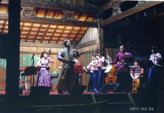 そして、最後にまた生徒も加わり、「星に願いを」、「海の見える町」、「賽馬」の曲を演奏しました。伝統的な水前寺能楽殿での劉福君先生との共演は盛大で華やかに幕を閉じました。