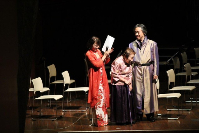 そして会場の感動の拍手が鳴り止まない中、御年96歳でお元気に二胡を楽しんでいらっしゃる人生の大先輩、熊本教室の吉村始芽さんが紹介されました。90歳から二胡を習い始め、いつも前向きな生き方に私たち生徒は、元気と勇気をいただいています。