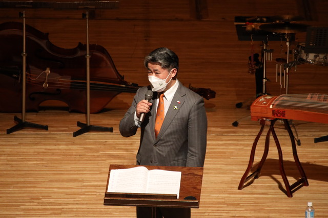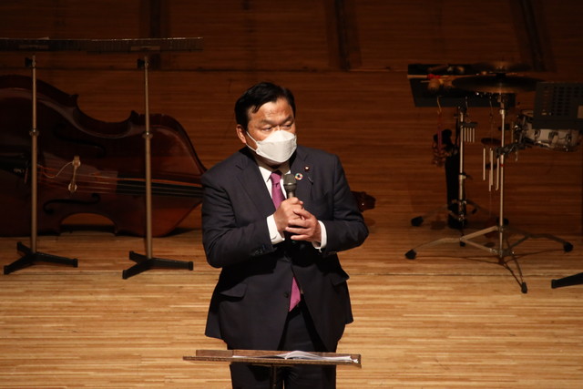 大合奏の後は、ご来賓の中華人民共和国駐大阪総領事の薛剣様と公明党衆議院議員の赤羽一嘉様からご挨拶をいただき、いよいよ日本の第一線でご活躍の一流の民族楽器演奏家の皆様の演奏が始まりました。