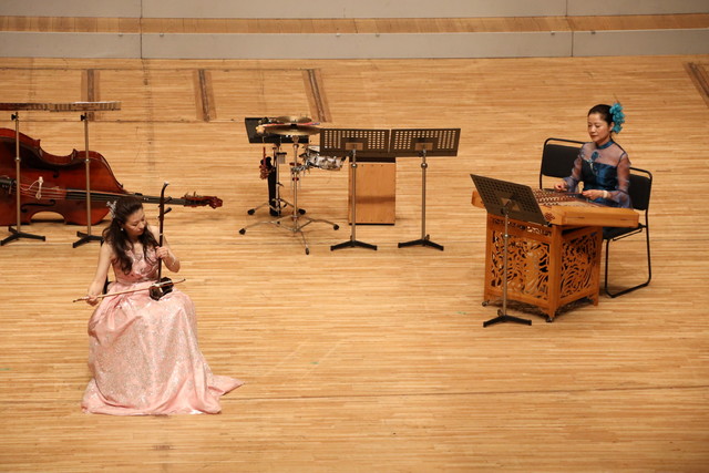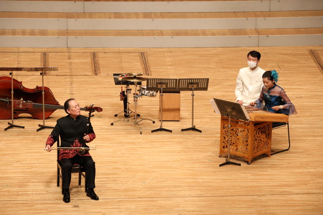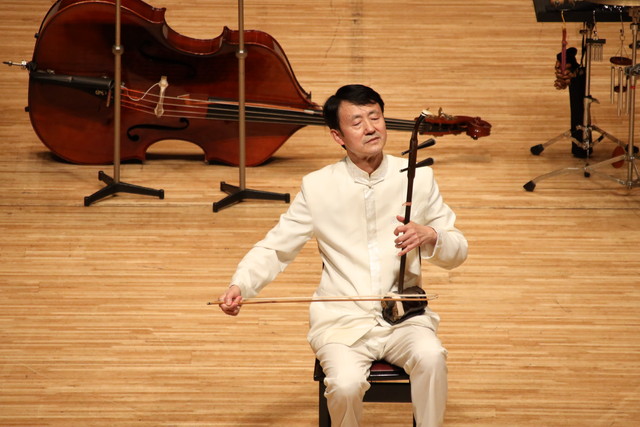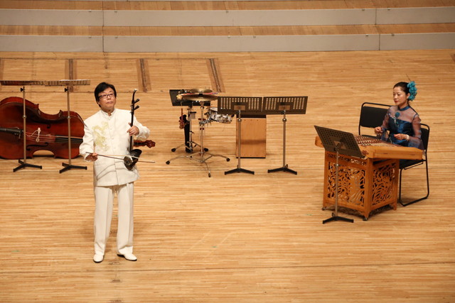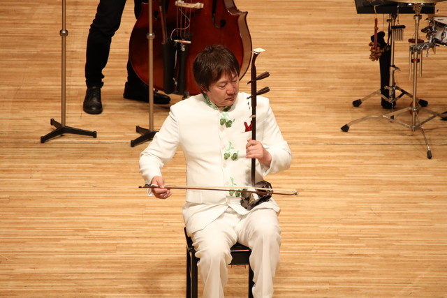 先生方の独奏最後は、張連生先生の「万馬奔騰」でした。行進曲とモンゴル民謡のメロディーを上手くアレンジしたこの曲は、疾走する馬の群れをパノラマのように捉え、壮大な景色を描いた作品です。二胡の演奏テクニックと張先生の熱演に会場のお客様から拍手が沸き起こり迫力ある素晴らしい演奏を披露してくださいました。