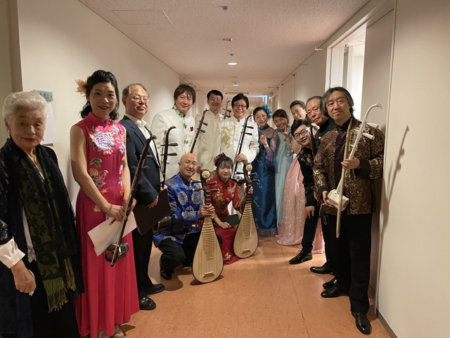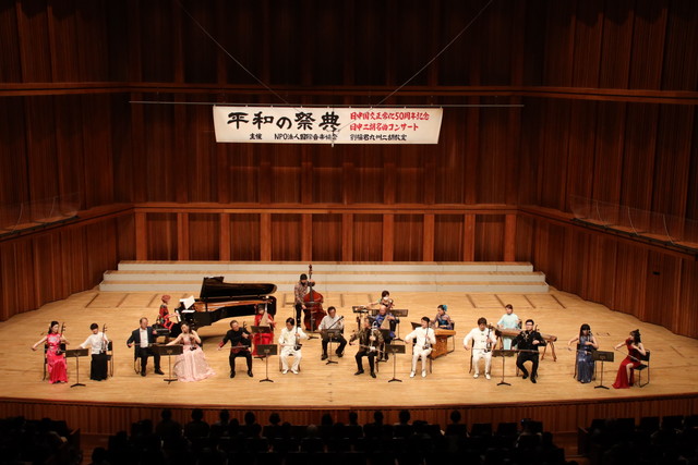 島の風の演奏のために福岡から沖縄三線奏者のたそがれ海童さんが駆けつけてくださり、二胡独奏でご出演の先生方10名に清水久恵さん、林宏美さんが加わり、琵琶の葉衛陽さん、さくらさん、揚琴の沈兵さん、古筝の戴茜さん、ピアノ月岡翔生子さん、ベース丹羽肇さん、打楽器村岡慈子さんで、沖縄の音階を基調にした抒情溢れるメロディーが奏でられました。温かく故郷の愛を吹いて広げ、美しい未来への憧れを吹き続ける島の風を表現したこの曲は演奏会最後に相応しく、未来も日中の平和と友好交流が続き世界が平和であることを願って、中国交正常化50周年記念「平和の祭典」日中二胡名曲コンサートに捧げられました。