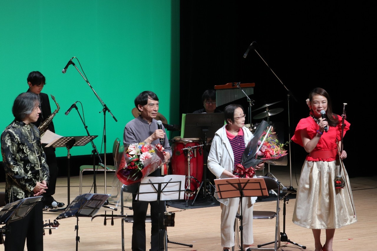 コンサート最後の曲の前には、大分では4年半ぶりに来日してくださった王永徳先生ご夫妻に再会の喜びと感謝の気持ちを込めて劉福君九州二胡教室から花束が贈呈されました。また、霧島では7日・9日の2日間、本当に素晴らしい心に響く演奏を聴かせていただいた出演者の皆様に、感謝の気持ちを込めて生徒達から花束が贈呈されました。霧島会場には、薩摩川内市国際交流員の唐靚さんと都城市国際交流員のかれんさんにもご来場いただき、かれんには流暢な日本語で王永徳先生の通訳をしていただきました。